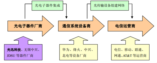 在光纖通信的產(chǎn)業(yè)鏈上,光電子器件生產(chǎn)處于產(chǎn)業(yè)鏈的上游,光電子器件行業(yè)的下游主要是通信系統(tǒng)設(shè)備行業(yè),光電子器件產(chǎn)品由通信系統(tǒng)設(shè)備廠商系統(tǒng)集成為光傳輸設(shè)備,然后再由通信系統(tǒng)設(shè)備廠商提供給電信運(yùn)營(yíng)商,由電信運(yùn)營(yíng)商構(gòu)建完整的通信網(wǎng)絡(luò)后向消費(fèi)者提供各種電信服務(wù)。