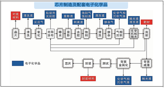 在完整的半導(dǎo)體生產(chǎn)工藝中,電子化學(xué)品使用頻率高且涉及的品種很多,以集 成電路為例,從硅片作為襯底開(kāi)始,一直到形成芯片,幾乎每步工序都需要電 子化學(xué)品 包括清洗液、反應(yīng)氣、粘結(jié)膠、光刻膠、顯影液、剝離液、蝕刻氣、蝕刻液、 清洗液、摻雜氣、化學(xué)氣相沉積氣體、拋光液清洗液、靶材、拋光液、化學(xué)氣 相沉積氣體、封裝材料等。