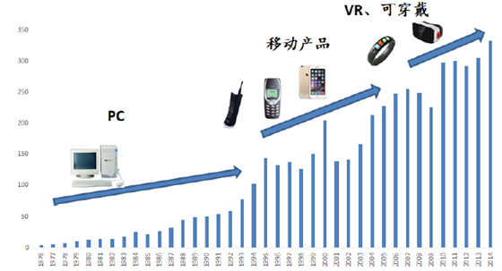 半導(dǎo)體是需求推進(jìn)的市場,在過去四十年中,推動半導(dǎo)體業(yè)增長的驅(qū)動力已由傳統(tǒng)的PC及相關(guān)聯(lián)產(chǎn)業(yè)轉(zhuǎn)向移動產(chǎn)品市場,包括智能手機及平板電腦等,未來則可能向可穿戴設(shè)備、VR/AR設(shè)備轉(zhuǎn)移。
