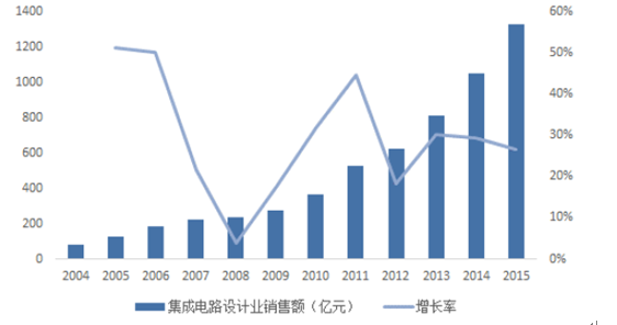 中國積極布局fabless。從銷售額來看,中國芯片設(shè)計業(yè)持續(xù)高速增長,產(chǎn)值由2004年82億元逐年成長至2015年1325億元,2004~2015年復(fù)合成長率達(dá)29%。