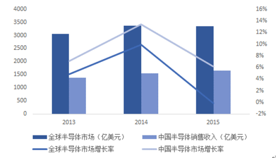 受宏觀經(jīng)濟(jì)因素的影響,全球半導(dǎo)體元器件需求不振。根據(jù)SIA公布的數(shù)據(jù),2015年全球半導(dǎo)體市場銷售額為3352億美元,同比下降了0.2%。全球半導(dǎo)體市場下滑的主要原因是PC銷售下降和智能手機出貨增速放緩。根據(jù)IDC統(tǒng)計,2015年全球PC和平板出貨量同比下降約10%,而智能手機的增速從2014年27%降至10.13%。