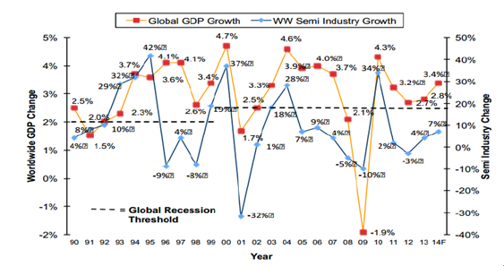 1990~2014年半導(dǎo)體市場增速和全球GDP增速