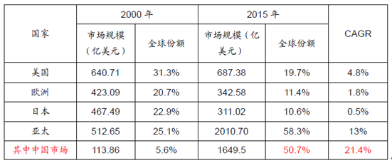 2000年~2015年的16年里,中國半導(dǎo)體市場增速領(lǐng)跑全球,達(dá)到21.4%,其中全球半導(dǎo)體年均增速是3.6%,美國將近5%,歐洲和日本都較低,亞太較高13%。就市場份額而言,目前中國半導(dǎo)體市場份額從5%提升到50%,成為全球的核心市場。