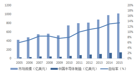 從市場規(guī)模和自制能力的角度來看,中國作為全球半導(dǎo)體核心市場,對半導(dǎo)體存在巨大需求,可是根據(jù)ICinsights的數(shù)據(jù),2015年國內(nèi)的半導(dǎo)體自給率僅為13.5%左右。